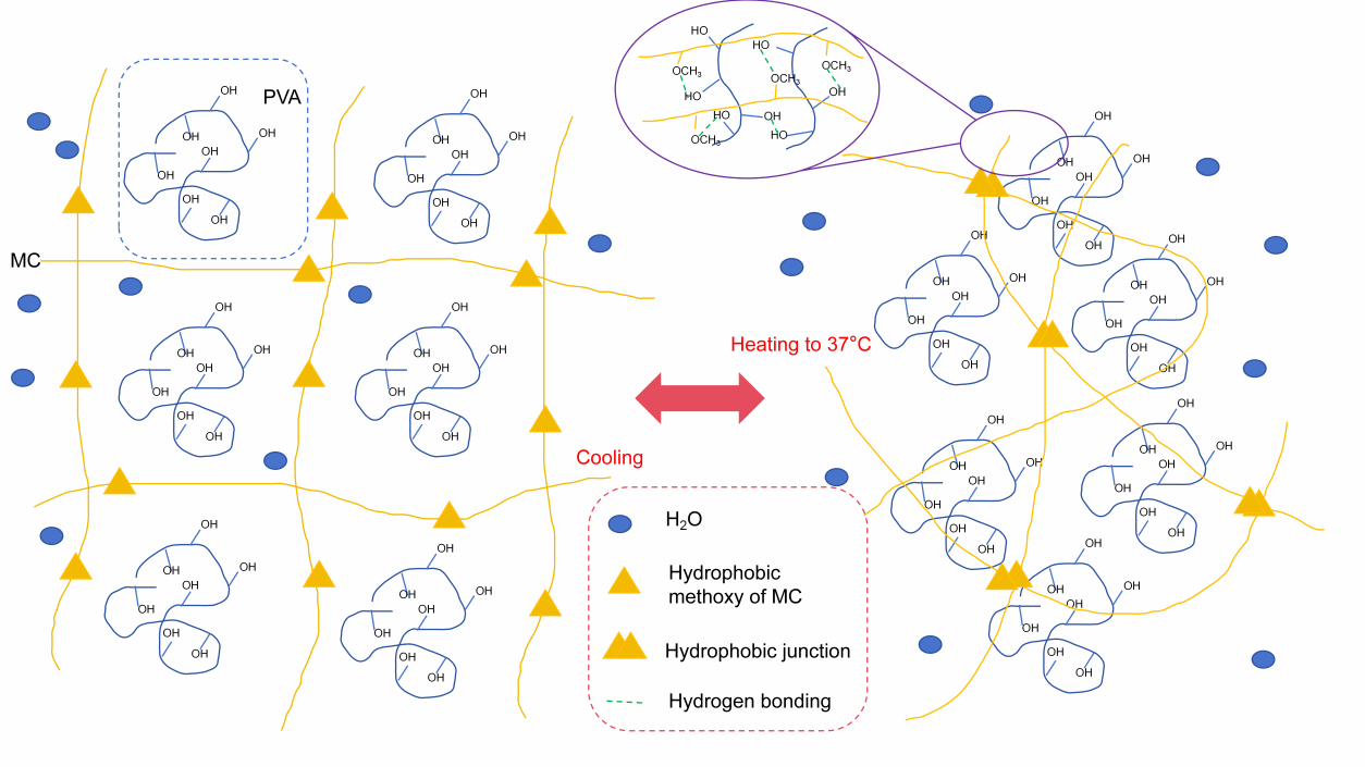 ● (图1)将甲基纤维素(MC)与聚乙烯醇(PVA)在磷酸盐缓冲溶液PBS中共混,通过物理交联可在37°C下发生溶胶-凝胶转变得到MC-PVA凝胶。