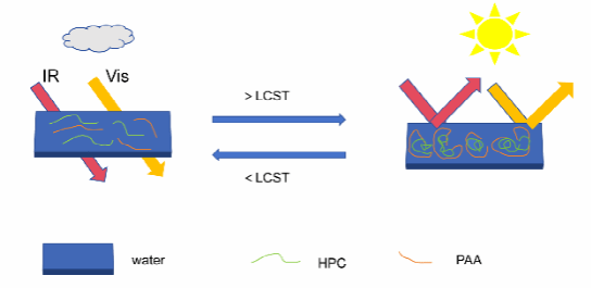 ● (图2)将羟丙基纤维素(HPC)与聚丙烯酸(PAA)共混,可得到温度/pH双响应的水凝胶。当pH从1变化到4时,HPC-PAA水凝胶的低临界转变温度(LCST)从10°C升高到40°C,酸度继续减弱到pH为6、7时,凝胶转变温度缓慢升高至44°C,然而当碱性增强到pH=10时,凝胶转变温度反而下降到43°C。