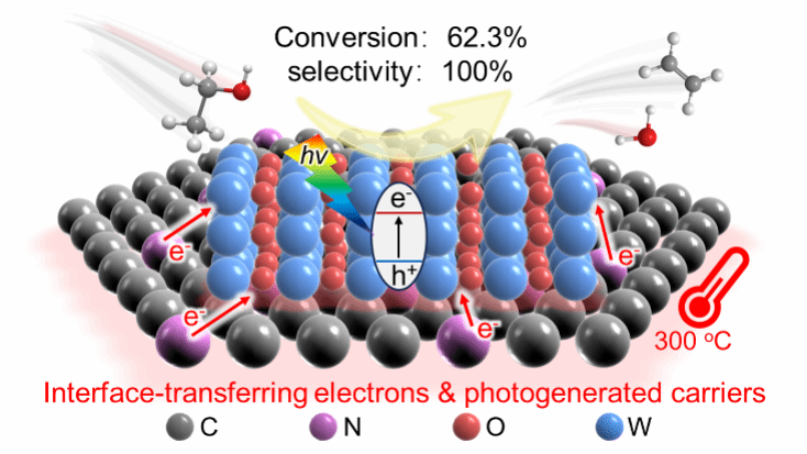 乙醇是一种生物质衍生的平台分子,可以通过光热催化转化为乙烯等高价值产品,为石油生产乙烯过程提供了一种可持续的替代工艺。然而,进一步提高催化性能需要合理地调节活性位点的电子浓度。在此,我们设计了一种W18O49/氮掺杂碳(NC)催化剂,该催化剂独特地集成了两种不同的电子:(i)从NC到W18O49的界面转移电子,以及(ii)由W18O49本身在光照射下产生的光生载流子。这种双通道电子汇聚结构使最优的W18O49/NC催化剂实现高效乙醇脱水生产乙烯,达到76.4 mmol gcat.-1产率(转化率高达62.3%,乙烯选择性约为100%),是相同辐照条件下原始W18O49的2.2倍。一系列表征证明了NC载体的界面转移电子与光生载流子协同产生富电子活性位点,从而促进C−O键裂解、加速乙醇脱水反应。表观活化能测试和原位傅里叶变换红外光谱进一步证明,来自NC载体的界面转移电子比光生载流子在乙醇活化过程中发挥着更重要的作用。本工作为研究光热催化乙醇脱水的机理提供了有价值的见解,并为合理设计高效光热催化剂提供了新的策略。