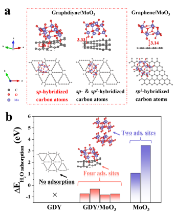 图1. (a) GDY/MoO3和Graphene/MoO3优化后原子结构;(b) GDY、GDY/MoO3、MoO3的水分子吸附能