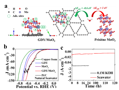图3. (a) H2O分子在GDY/MoO3-Vo和纯MoO3上吸附位置示意图;(b) 样品在0.1M KOH溶液中的极化曲线;(c) GDY / MoO3在0.1 M KOH和天然海水中的时间-电流曲线