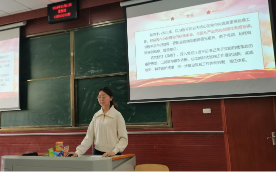 首先亢佳璇同志带领支部成员学习了习近平总书记在二十届中央纪委三次全会上的重要讲话精神和《中国共产党巡视工作条例》,通过这一学习,大家对党的纪律建设和巡视工作的重要性有了更为明确的认识。在巩固拓展学习贯彻习近平新时代中国特色社会主义思想主题教育成果的环节,她针对“作为一名师范生党员,如何将主题教育成果转化为工作实践,为推进中国式教育现代化助力”发表了自己的看法,认为要做一个学习型的党员,就要把学习到的好的理念和方法进行主动尝试,有计划的融入课堂,同时也要做到关爱学生,以学生为本。