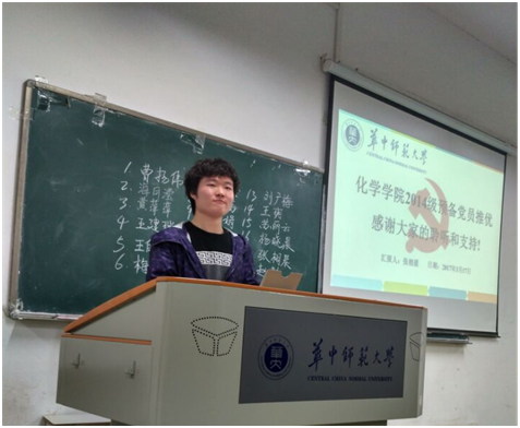通讯员 谢晓英 2017年3月17日晚六点半,中共华中师范大学化学学院本科生14、15级联合党支部在8204召开2014级发展对象推选大会。此次大会由支部副书记王秀芳主持,与会者有党支部全体成员、18位候选人以及各班群众代表。大会的主要内容是发展对象候选人上台五分钟演讲及五分钟民主评议。
