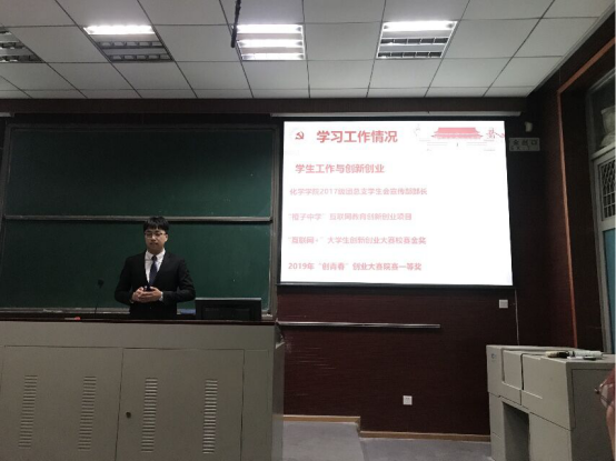 (新闻中心消息 通讯员 毛莉 时路佳)2019年11月3日晚,化学学院2017级发展对象答辩会在化学楼201教室顺利开展,共有8位入党积极分子参与答辩。出席答辩的嘉宾有红石榴党支部书记武双欣、菁英党支部书记马莹、化学学院辅导员安晓蕾、孙煜林。在校的全体化学学院本科生红石榴党支部、菁英党支部成员和每班5位同学组成评委团。
