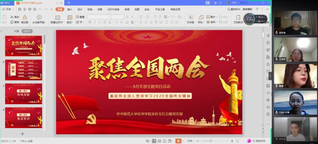 新闻中心消息 记者 毛莉2020年全国两会,是在全国疫情防控阻击战取得重大战略成果之际召开的,不同寻常。5月29日晚,化学学院本科生红石榴党支部在腾讯会议平台开展了5月主题党日活动。旨在深入学习贯彻两会精神,全面领会《政府工作报告》的相关内容,真正把党员群众的思想统一到会议精神来上,同时为各位党员搭建互相交流学习的平台,增添支部活力。本次会议由2016级中共党员刘璐主持,化学学院本科生红石榴党支部书记武双欣、辅导员孙煜林及支部32名党员同志参加了此次会议。