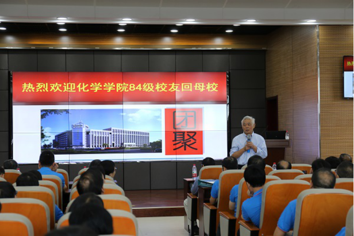 稍后,化学学院党委书记杨军亲切地说到,我是86年到化学学院学习的,今天来的诸位都是我的学长学姐,我代表学院欢迎学长学姐的到来。随后他向大家介绍了化学学院在近年来的发展概况。他谈到,如今无论从师资力量还是从仪器设备上来讲,化学学院的条件相较于三十年前都有了非常大的改善。这离不开我们一代又一代的化院人做出的卓越贡献。