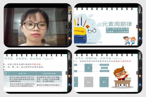 打响头阵的是来自1710班的丘海婷,她说课的题目是《元素周期律》。她首先对于相关的教材内容进行了多方面的分析,再从知识、能力、思维、情意四个方面阐述了学生当前的学情,再详细叙述了教学目标、教学过程。之后,她根据所设计的教学过程,进行了相应的板书设计,并提取了本节课的教学重难点和在本节课程中使用的教学方法。最后她根据自己设定的教学目标,采取了相应的手段对于本节课学生的学习水平进行了评价。