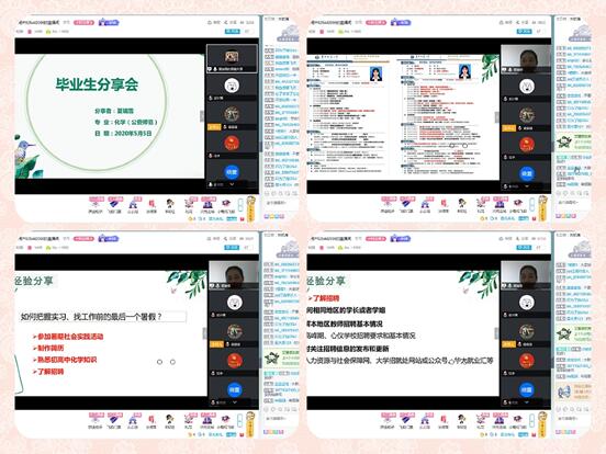 新闻中心消息 审核人:安晓蕾 通讯员 章家瑜5月5日晚,华中师范大学化学学院2017级晚点名暨“木兰花开,余香盈袖”优秀毕业生分享会(第一期)通过哔哩哔哩平台顺利开展,本次活动由共青团华中师范大学化学学院委员会主办、化学学院红石榴学习发展中心和化学学院2017级团总支学生会承办。本期分享会邀请了化学学院2016级夏瑞雪、孙浩然、汪宇3位公费师范生对师范生实习、就业等方面的问题进行了分享,旨在提高同学们的职业规划能力以及就业竞争力,为今后的实习以及就业打下良好的基础。分享会由2017级辅导员安晓蕾主持,2017级全体本科生参与。