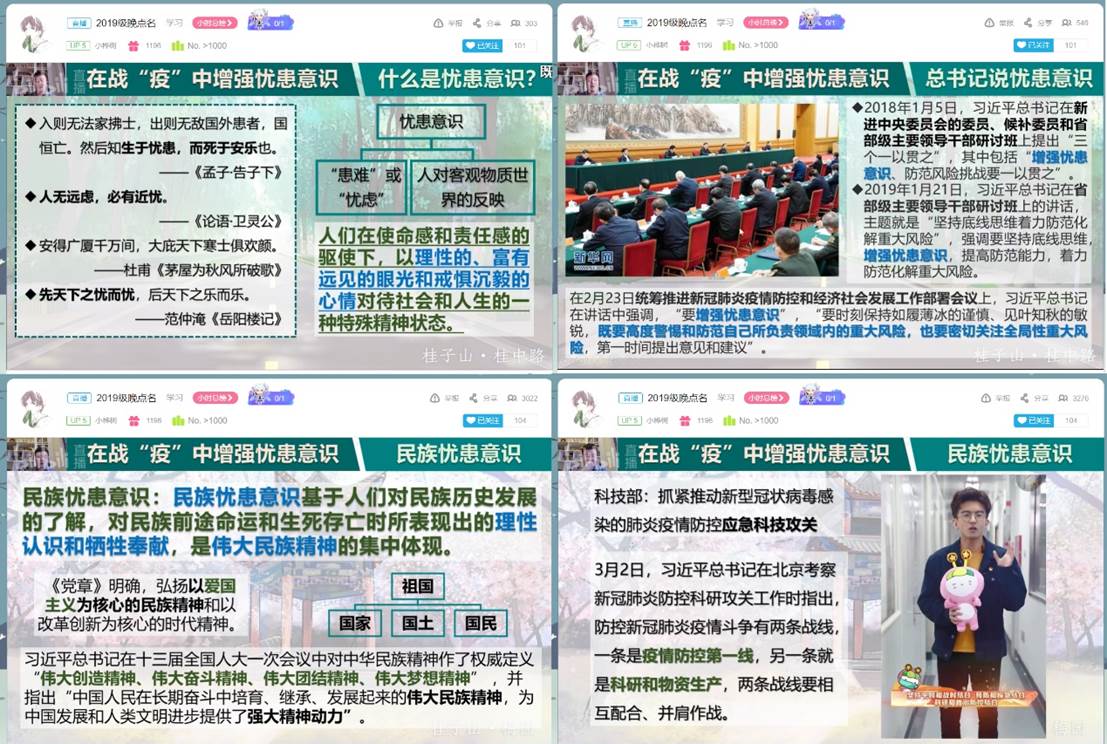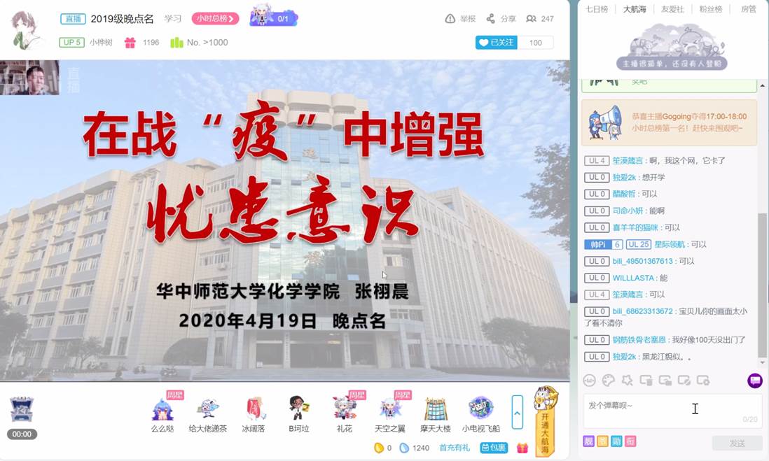 通讯员:付艳颖 张杨 为加强同学们的忧患意识,以更加理性的态度看待社会和人生,化学学院2019级兼职辅导员张栩晨于4月19日晚在哔哩哔哩直播间开展了“在战‘疫’中增强忧患意识”线上晚点名主题教育,19级学生收看了晚点名直播。本学期,我院各年级晚点名均积极落实学校关于晚点名主题教育安排,在前期已经开展有生命健康教育、责任教育、国家安全教育等晚点名主题教育课。本次晚点名集中开展忧患意识教育,兼职辅导员张栩晨老师主要围绕什么是忧患意识,总书记说忧患意识,如何树立正确的忧患意识等多个方面展开主题教育。