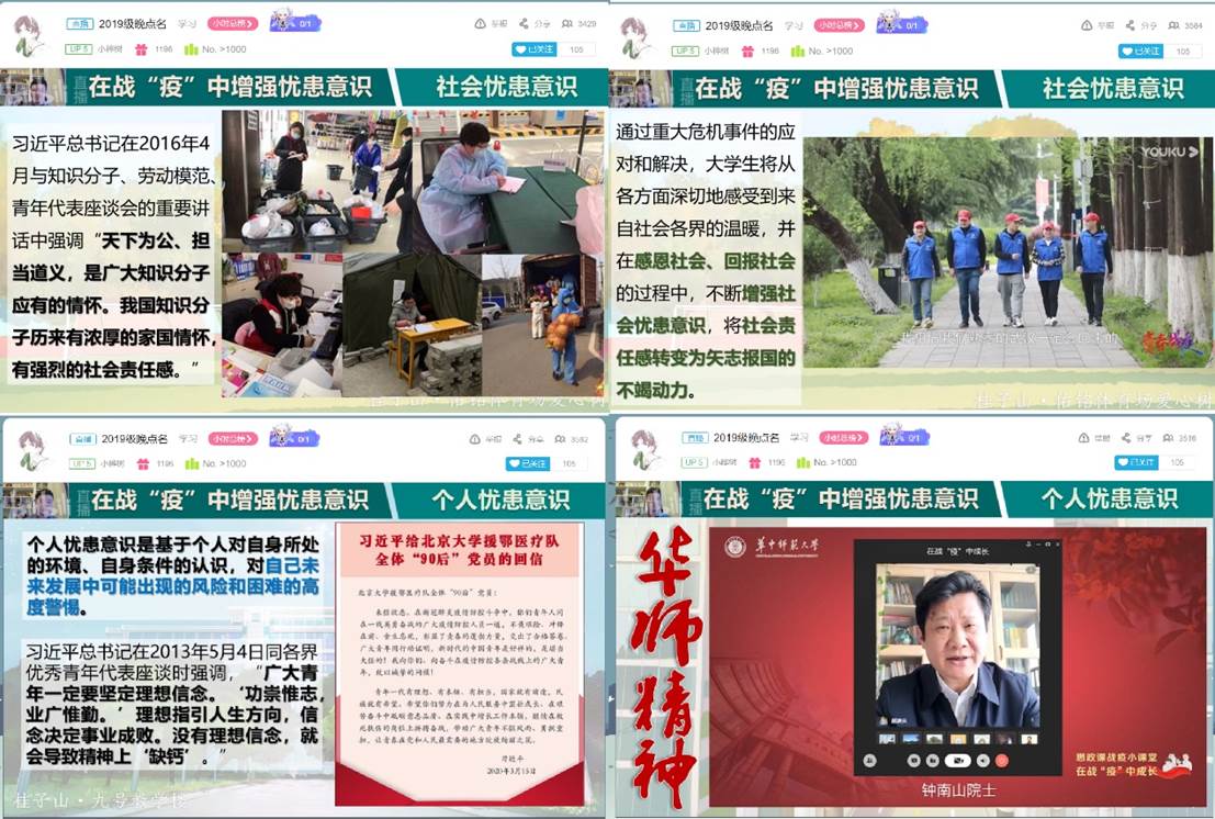 19级丛诗琳同学说道:“本次晚点名,我收获颇丰,在此次疫情中,我们不仅可以看到个人无私的奉献,祖国强大的支持,还会更加清楚我们应该有的担当和社会对我们的期许,这些都是忧患意识的体现。北海虽赊,扶摇可接;东隅已逝,桑榆非晚,我会时刻谨记民族忧患、社会忧患和个人忧患意识,并在华师精神的影响下,不断提升自己,充实自己,为实现自己的价值打下坚实基础。”至此,本次晚点名圆满结束。