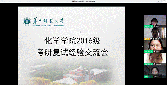 会议伊始,主持人朱胜强就此次交流会作简要介绍,由于疫情缘故,2020年研究生入学复试工作情况复杂,为帮助学生顺利备考,华中师范大学化学学院特举办此次考研复试经验交流会,旨在为2016级考研学生解决复试准备中存在的疑问,确保学生考研复试备考工作顺利进行。