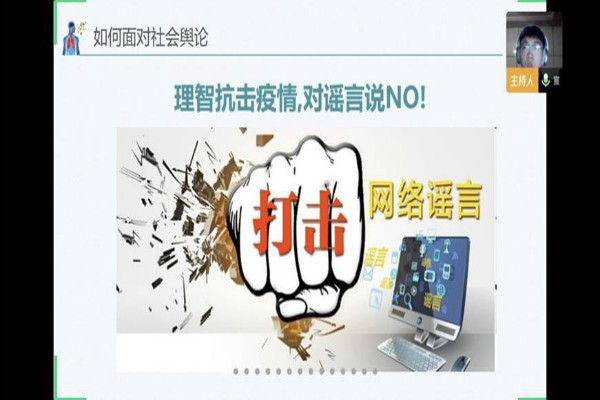 会议最后一项,化学学院理论宣讲团进行有关“疫情期间的谣言鉴别与网络公德”的主题宣讲。章家瑜从新冠肺炎疫情期间的谣言鉴别、如何辨别网络谣言、如何面对社会舆论三个方面展开,和同学们积极互动揭秘真相,结合真实案例,总结识别谣言的高效方法。宣讲最后,他说:“可以不说话,但不可以说谎话。”以此呼吁大学生面对舆论要理性甄别,践行责任担当,共同维护健康网络环境,为打赢这场疫情阻击战贡献力量。至此,华中师范大学化学学院2020年四月团支书联席会议圆满结束。