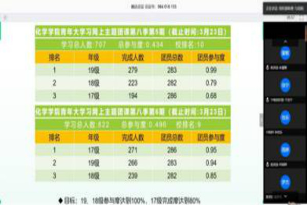 会议第二项,进行三月团日活动公示。1702团支部排名第一,1709团支部排名第二,19级团支部排名第三。随后,展示三月团日活动风采。其中,2019级举行了线上答题竞赛、才艺展示活动,2018级开展了疫情知识检测、班级接力和班级班会宣传活动,在保证高参与度的同时彰显了班级特色。2017级各班开展的团日活动中,由化院1702、城环1705、外院1708、外院1709团支部联合举办的“青春战役,同舟共济”团日活动邀请到校团委副书记、三院团委书记和辅导员共七位老师参与并分享,取得良好效果。接着,进行“青年大学习”情况汇报。马培妍公布了第五、六期主题团课的参与度排名,提出了各年级的明确目标。