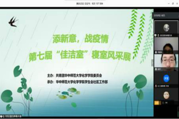 新闻中心消息 通讯员 林凯菁 关莹4月3日晚,华中师范大学化学学院第七届“佳洁室”寝室风采展在线上顺利举行。此次比赛由共青团华中师范大学化学学院委员会主办、华中师范大学化学学院学生会社区工作部承办。值此疫情防控的关键时期,本次比赛旨在展示学生们的精神风貌,帮助学生树立正确的价值观和培养良好的生活习惯,养成更完善的人格。