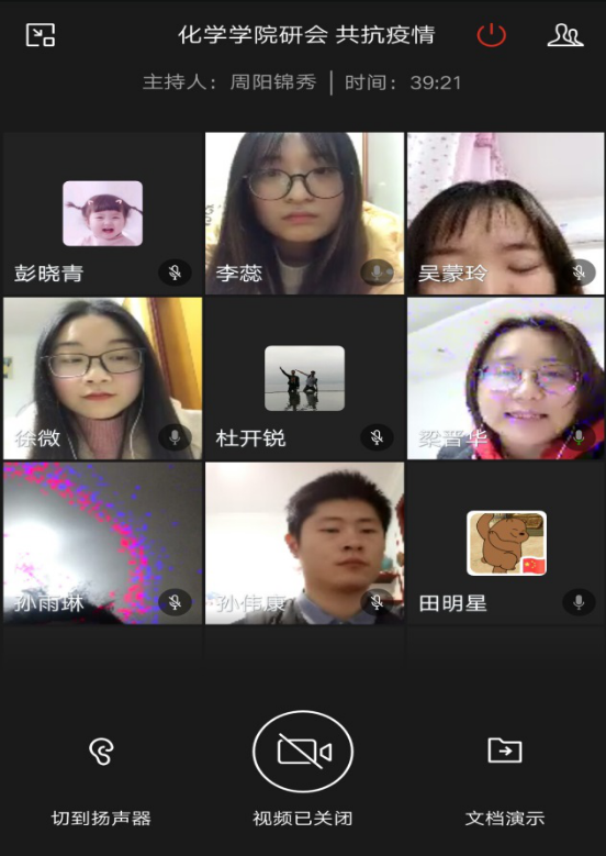研会宣传部讯(通讯员 陈鑫)2月28日晚,化学学院研究生会新学期第一次线上例会顺利进行。本次例会在新冠疫情背景下,旨在对新学期研究生会的工作进行部署并宣讲爱国、爱党精神,参与会议的人员有研究生辅导员梁晋华、研一党支部书记徐微和研究生会全体成员。会议由研究生会主席周阳锦秀主持。