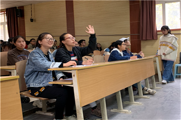 随后是激烈的抢答环节,主持人随机抽取两支队伍(最后一轮为三支队伍)进行比赛。每支队伍派出两名选手参赛,抢答PPT上的题目,题目涉及无机化学、有机化学等化学知识。抢答过程中,选手们表现活跃且不失沉稳,审题、运算、举手、作答,将比赛推向了高潮,台上的选手积极答题,台下的选手也不敢懈怠,为之后的出场作准备。