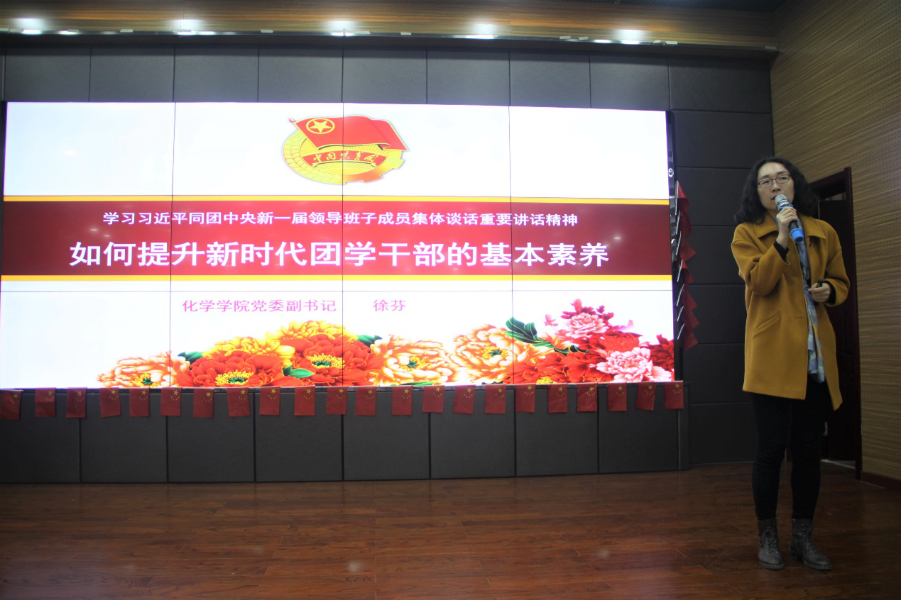 本次典礼由化学学院团委组织部部长肖仁可主持。会议伊始,徐芬就“如何提升新时代团学干部的基本素养”发表讲话。她首先从团干培训的收获、如何认识学生干部这一话题出发,和同学们亲切交流,并就同学们发表的观点进行总结和补充。其中,黄琳婧同学谈到通过团干培训文案课程不仅让她对于策划案的书写、office的使用更加熟悉,更培养了她做事认真耐心的态度。