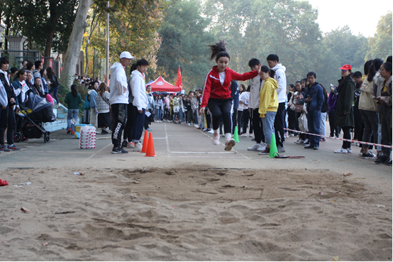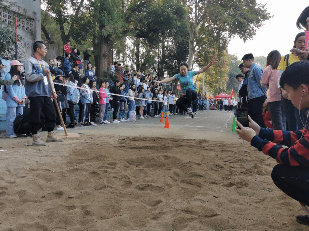在各位选手佩戴好号码牌、试跳完毕后,比赛即将开始。首先出场的是参加了连续参加三年校运会跳远比赛的陈腾瑛,当裁判挥动手中的红旗示意开始后,陈腾瑛已经做好了准备。她目光坚定,从容不迫,先是助跑了一段距离,让自己加速。然后她大步奔跑到起跳板前,用尽全身力气纵身一跃,瞬间轻盈地腾空而起,双臂微张,犹如一只展翅飞翔的燕子。她的身体在空中划出了一道优美的弧线,最后稳稳的落在了沙地上。真可谓是“身轻如燕,一跃千里”。陈腾瑛最终以3.95米的好成绩获得了女子跳远第四名。