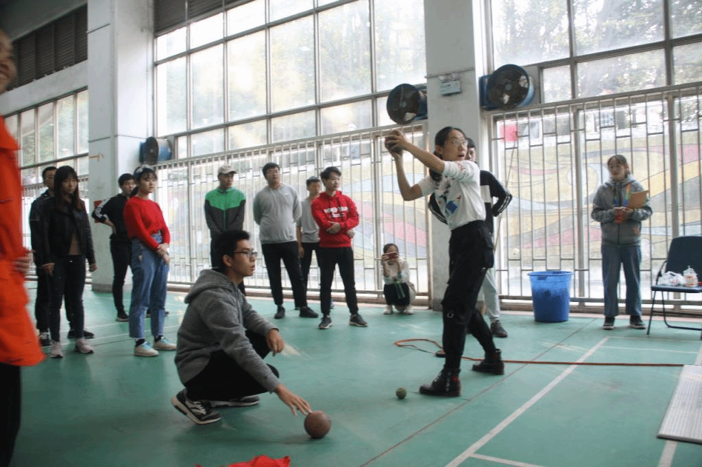 比赛尚未开始,深秋的清晨令人感到些许寒冷,化学学院混合组后抛实心球参赛队伍提前到馆,进行最后的调整和注意事项的提醒。片刻,在工作人员的带领下,21名参赛选手进入比赛场地,他们虽淡定自若、从容不迫,但由于昏暗的馆内环境,空气中还是弥漫着些许焦灼、紧张的气息。