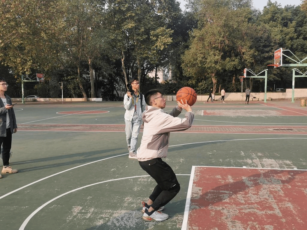定点投篮要求每人在五个定点分别投篮,记录10人投篮命中的总数,根据总数的多少确定比赛名次。化院参赛队早早地来到了篮球场,进行赛前的热身准备和投篮练习。即使是赛前的练习,每位队员仍旧毫不懈怠、全神贯注,他们互相分享自己的投篮技巧,调换不同的姿势不停歇地练习着。这期间有欢笑,有鼓励,气氛十分融洽和谐。