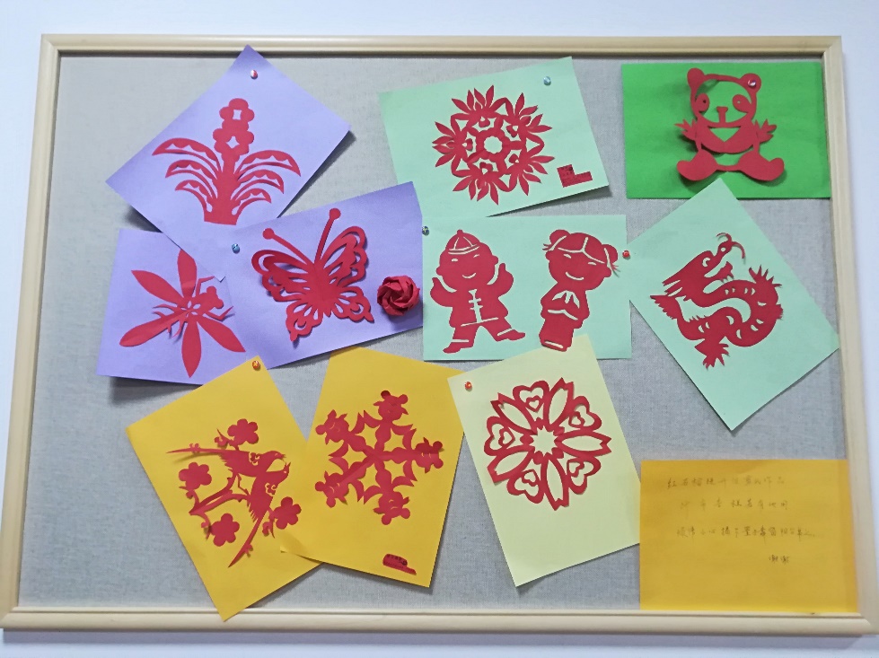 一个半小时过后,同学们完成了包括十二生肖图案、花草昆虫、京剧脸谱图案等各种样式的剪纸作品。最后在场所有同学与自己的作品合影留念。至此,此次弘扬中华传统文化活动之剪纸艺术传承活动落下帷幕。