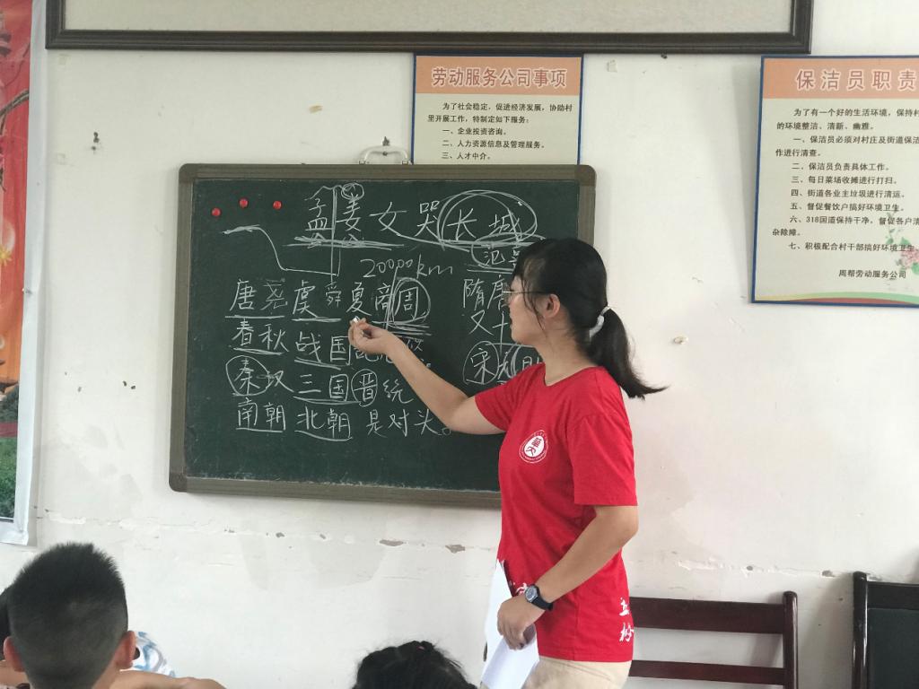 新闻中心消息 通讯员 刘润芝化学学院党员先锋实践队在湖北省仙桃市长埫口镇周帮村开展了为期5天的实践活动。8月27日,为了增强周帮村的文化建设,响应党的号召,实践队队长卢乙鑫、队员李璇分别以历史课、语文课为依托为学生带来了“三国演义”与“长城的故事”。希望通过这两节课的学习引起学生对传统文化的兴趣,从而加强其对中华文化的自信。