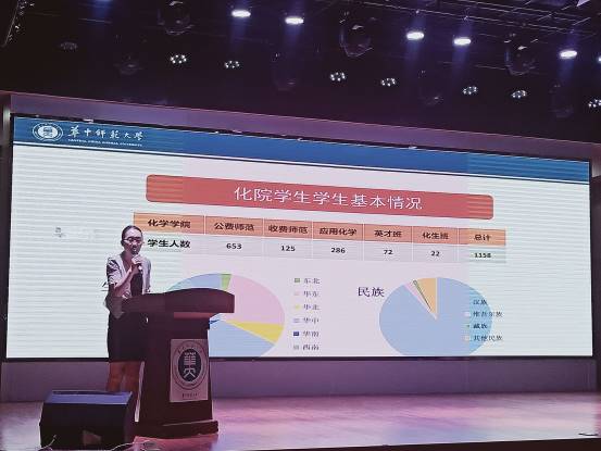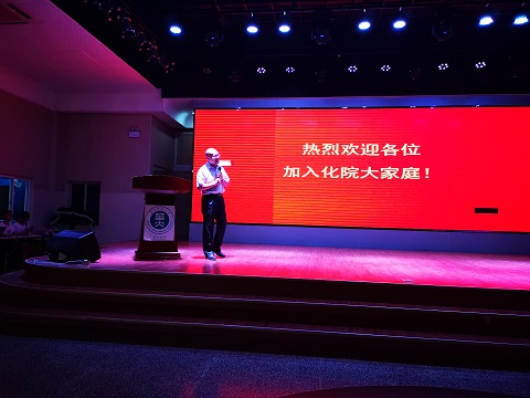 在见面会正式开始之前,化学学院团委副书记兼宣传中心主任毛莉带领新生学唱了校歌。虽然新生们对校歌尚且陌生,但激昂的旋律仍然带动着在场学生,现场的气氛活跃起来。接下来各班班主任上台做了自我介绍,同时表示了与新生共同学习、共同进步的决心,热烈的掌声回荡在现场。接着,邱宝国给新生讲解了化学学院发展历程和基本信息,表达了对新生四年充实生活的期待,并祝福新生能够有充分的收获。让新生对自己的学院有初步认识,初步培养起对学院的自信心。