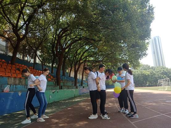 上午十点,提升组成员在高职体育场集合,在刘鹏的指导下开始活动。第一环节的夹气球跑,两人一组背靠背夹住两个气球在起点向终点跑,到了终点后要把气球夹爆,消耗时间最少的一组将获胜。这考验了组员们在运输气球过程中有无默契和一起挤爆气球的勇气。