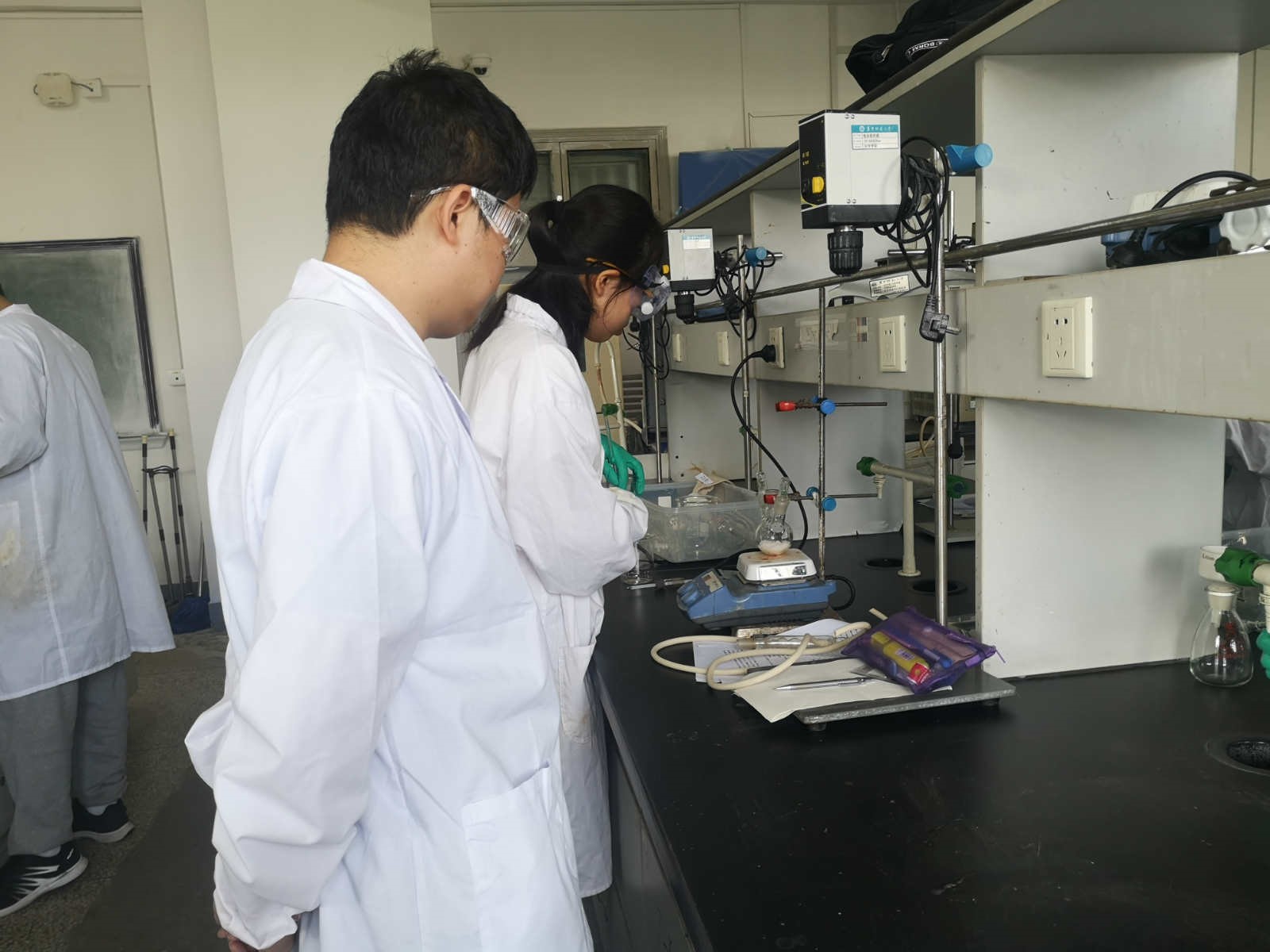 上午八点半,无机实验比赛在化学楼三楼进行。首先,评委老师言简意赅地讲述了实验内容、实验注意事项。发放考试试卷之后,无机实验的参赛选手们便开始了实验前的准备工作。准备工作完成后,参赛选手的注意力便牢牢地固定在自己面前的制备仪器之中,丝毫不为外界干扰因素所影响。评委老师也纷纷行动起来,近距离地观察参赛选手的操作水平以及药品制作效果,并为参赛选手进行分步评分。虽然制备方式复杂、制备时间长,但是各位选手依然一丝不苟地完成称量、搅拌溶解、抽滤以及分析滴定等实验过程。