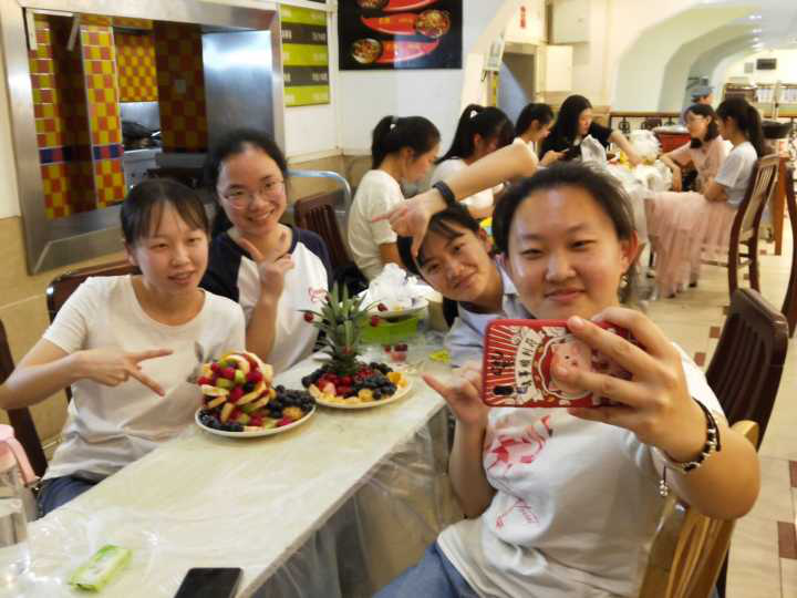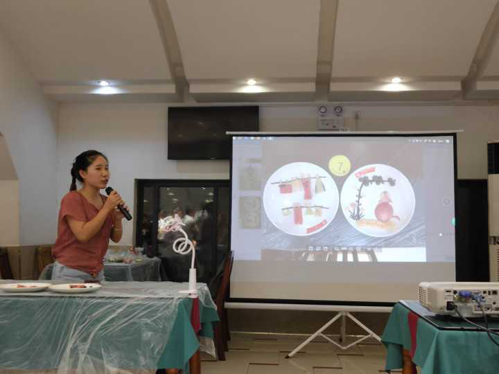 晚七时许,各参赛队伍陆续按照桌号就坐。在主持人宣布活动开始后,便开始设计制作自己的拼盘。放眼望去,每张桌上都摆满了各式各样新鲜的水果,各位参赛选手热情洋溢,与队友一起共同创作。即使在有限的原料和空间的限制下,大家都在精心地切割和雕刻作品,依旧发挥独特的想象力和团队协作能力。选手们选材广泛,作品创意十足,就连作品命名也是新意十足,如春色满园、海底世界、听取蛙声一片等等。在现场讲解环节,他们依次将作品放置于评分台上,并介绍自己的作品,阐述拼盘的寓意。评委们认真记录相关要点,品尝作品,并为选手们的作品评分,现场气氛高涨。