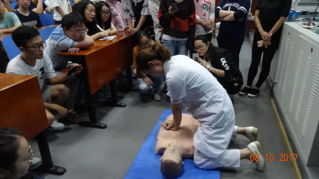 首先,祁院花围绕心肺复苏的意义、现实困难、心肺骤停的定义、猝死的判断以及时间就是生命几个方面展开介绍。其中,关于现实困难,祁院花指出:“目前我国120急救人员到达现场至少需要5-10分钟,遇上塞车等交通问题时间更长,对于心跳骤停的病人,最好的处理不是争分夺秒地去医院,而是立即就地抢救,许多濒临死亡的危重病人能够得以生还,在很大程度上取决于现场目击者卓有成效的及时救护。”获得了全场同学的一致认同。“求救是每个人的权利,而施救亦是每个人的责任和义务,理解、信任、诚恳应该在急救现场得以体现!”也让同学们意识到了解相关急救措施的重要性和必要性。