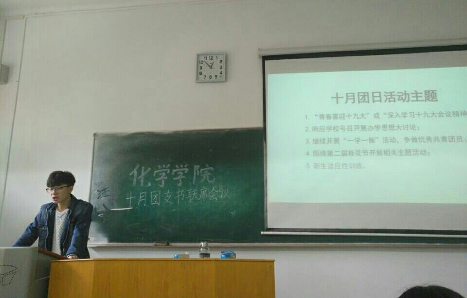 新闻中心消息 通讯员 毛莉 刘阳春10月15日12:00,由化学学院团委学生会组织部举办的2017年十月团支书联席会议在七号楼207教室召开。此次活动旨在保证团日活动的顺利进行,加强并发扬谦虚谨慎,艰苦奋斗的作风。化学学院团委书记安晓蕾老师,化学学院团委副书记张洁、刘诗雨、化学学院团委学生会组织部部长徐浬、副部长乐巧媛、夏雅蓓以及组织部全体助理、15、16、17级各团总支、团支书、组织部长出席了本次会议。