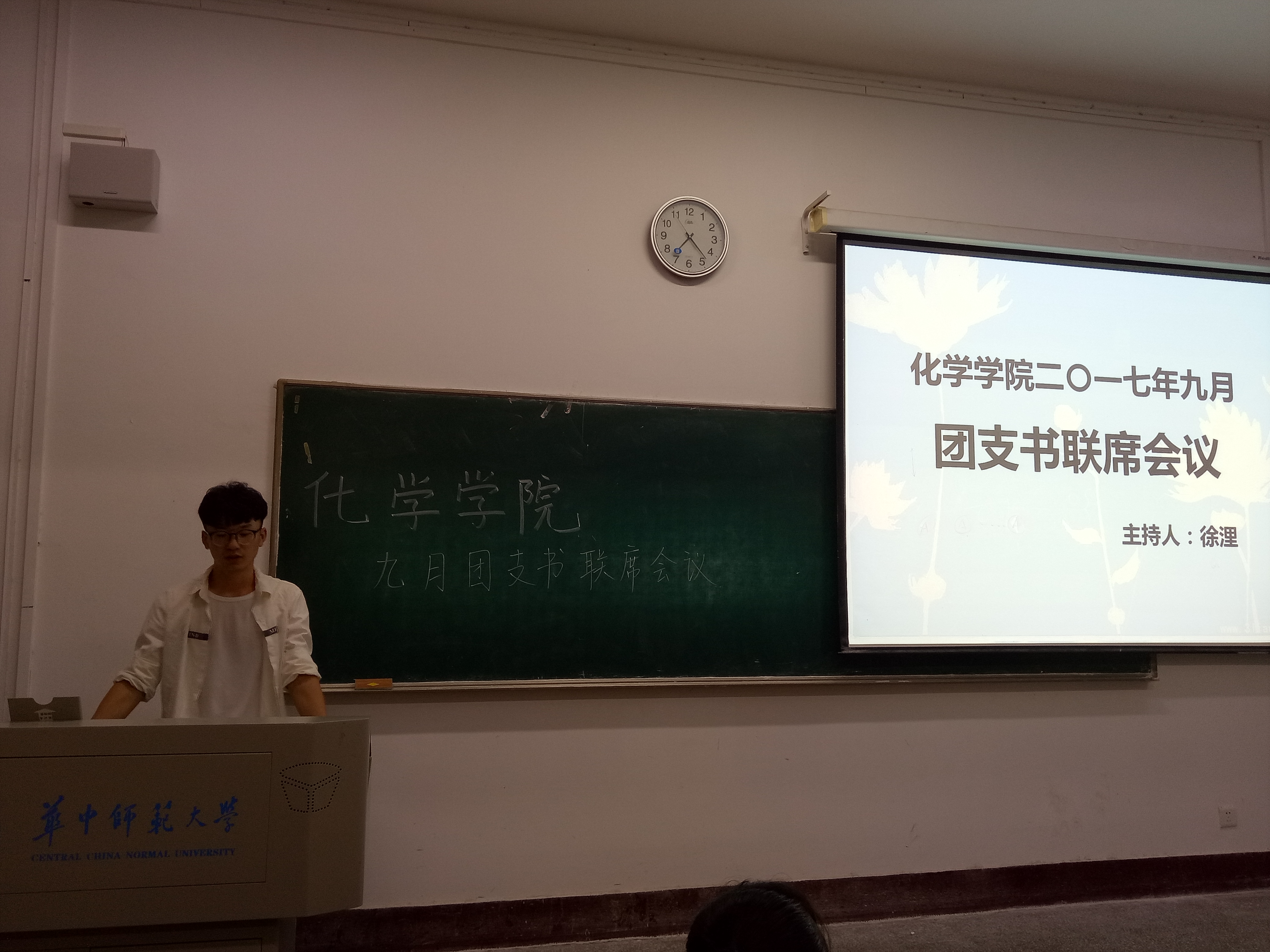 新闻中心消息 通讯员 张迎晨9月23日19:00,化学学院2017年秋季第一次团支书联席会议在7号教学楼7105教室成功举行。化学学院团委副书记刘诗雨、张洁;化学学院团委学生会组织部部长徐浬,副部长乐巧媛、夏雅蓓;15、16级各团总支、组织部长、团支书出席了本次会议。会议由徐浬主持。