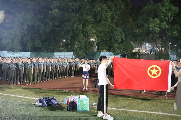 本次活动由化院团委学生会组织部部长徐浬主持。活动第一项:组织部副部长乐巧媛带领新生重温入团誓词。中国共产主义青年团建团于1922年5月,至今已有95年的历史。共青团作为中国共产党领导的先进青年群众组织和广大青年在实践中学习中国特色社会主义以及共产主义的学校,在近百年中发挥了巨大的作用。此时,新生们带着庄重的心情站在鲜红的团旗前,脸上挂着庄严肃穆的表情,清晰而又洪亮的诵出庄重的誓词。每个人的眼中都闪烁着坚韧的目光——他们的革命热情正在军训的锤炼下熠熠生辉。