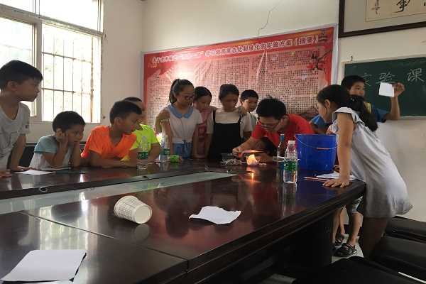 新闻中心消息通讯员 汪宇 8月26日,党员先锋实践队支教活动的第三天。为了提高同学们的动手能力,培养同学们的科学探索素养,展现化学的特色学科魅力,党员先锋实践队队员们开展了精彩的实验课。出于对实验的好奇,同学们表现得十分认真,操作简单现象明显的实验就此开始。