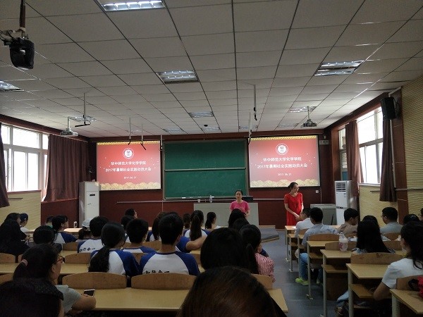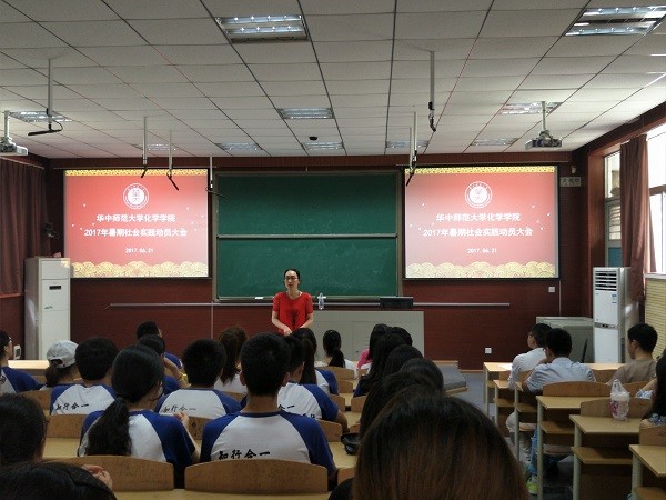 新闻中心消息 通讯员 张炜珏 6月21日中午12:30,在华中师范大学化学学院在化学楼H101召开了2017年暑期社会实践动员大会。本次会议由化学学院辅导员安晓蕾主持。出席人员有化学学院党委副书记徐芬老师,化学学院团委副书记马莹老师,化学党员先锋队队员,博雅行知支教队队员,心毅志愿队队员,以及三个境外游学队伍,东京、新加坡、港澳三支队伍的队员。