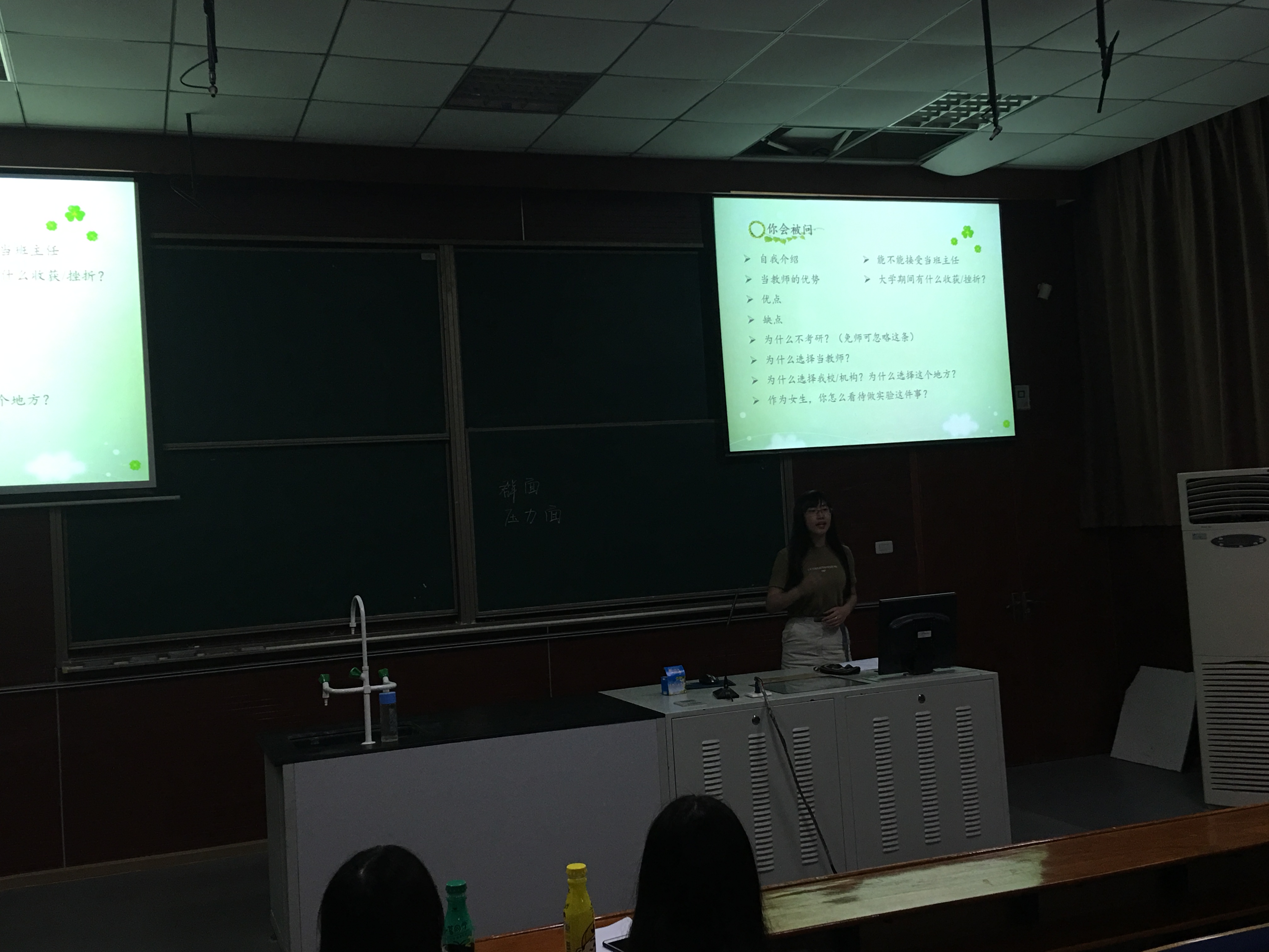 张棋是应用化学专业的同学,毕业时可以选择继续升学读研究生,也可以直接就业,而就业也有教师行业以及其他行业等不同的选择。她通过身边同学的求职经验为例,建议同学们一定要事先想清楚自己是否真的要找工作,以自己目前的能力能找到的工作是否能让自己满意或者至少能够接受,不要等到求职失利的时候再转过头来考研,或者等工作过后才发现自己找的工作不适合自己而又再次回头考研,这样对每个人的时间和精力的利用都是低效率的。她还向同学们展示了一些制作精致的简历、自荐信、个人能力证明等文件,强调了求职的时候一定要突出自身优势的思路。