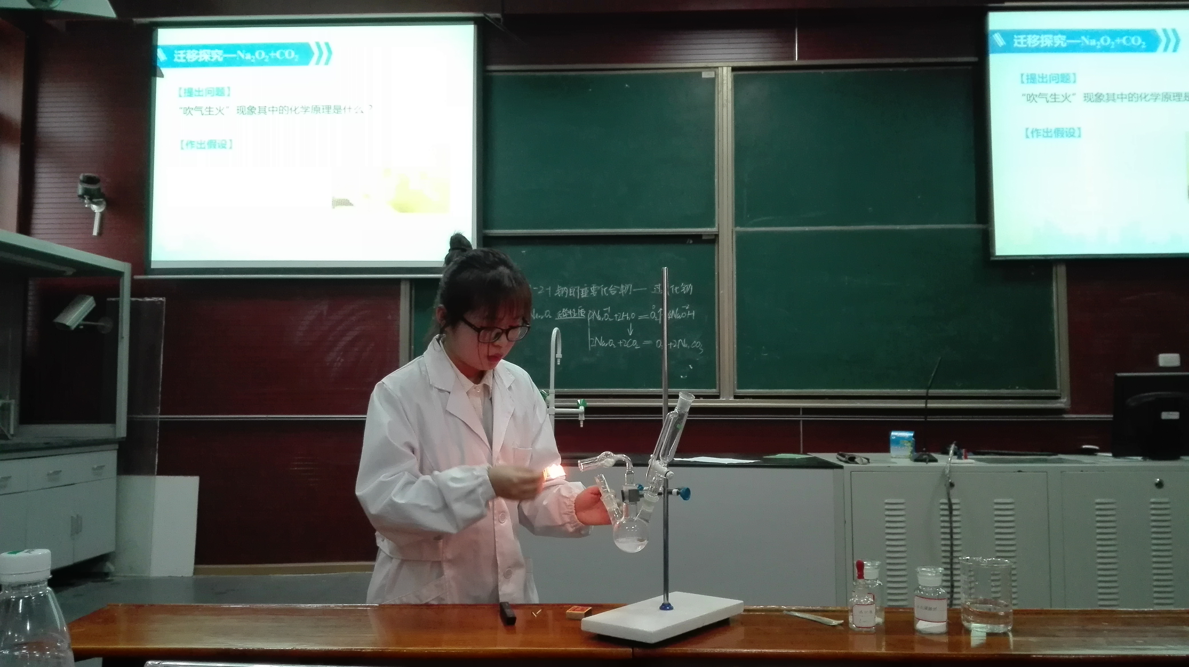 第一位选手文小会为大家带来了《金属的电化学腐蚀》一节的模拟授课,在十五分钟内,她通过生活中常见物品——暖宝宝的发热原理引入了“电化学腐蚀”这一概念。比赛现场上,她还用自制的U型管装置探究了暖宝宝中铁粉的析氢腐蚀和吸氧腐蚀,充分展示了化学学科中以实验为基础的趣味性探究。第二位选手王亚男则带来了《焓变和反应热》一节的模拟授课,授课过程中,她强调了问答法的采用,鼓励用问题来引导学生思考,让学生在讨论学习中对所学内容达到更深入的理解。第三位选手冯柳带来的是《共价键》一节的模拟授课,不同于其他的选手的选题,她选择了学术性更强的选修内容,为了使同学们更好地理解微观中共价键的成键过程,她用不同颜色、大小的小气球来模拟电子轨道模型,在增加课程趣味性的过程中无形降低了学生理解的难度。最后一位选手边渝茜同学展示了《过氧化钠》一节的模拟授课,为了更好地讲授过氧化钠的性质和几个典型反应,她设计了精彩的演示实验来探究过氧化钠与水、二氧化碳的生成物。
