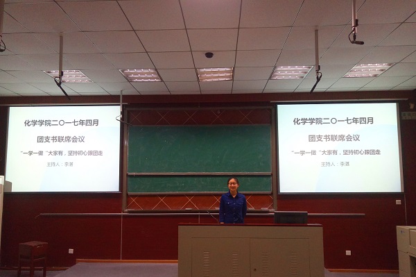 新闻中心消息 记者 张迎晨4月22日晚,化学学院2017年四月团支书联席会议在逸夫化学楼101教室举行。本次会议以“‘一学一做’大家有,坚持初心跟团走”为主题。化学学院团委副书记(教师)马莹、团委副书记陈嘉敏、李丹悦、化院团委学生会组织部部长刘诗雨、副部长李昌镖、李慧,化学学院2014、2015、2016级各年级团总支、组织部部长、支部书记以及组织部助理出席了此次会议。