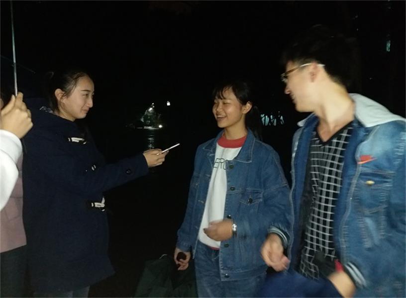 虽然外面还下着小雨,却依旧无法浇灭同学们的热情,半小时后,由组长带领的四个小队都回来了。同学们叽叽喳喳地讨论着采访的内容,最后,四位组长作为每组的代表发表了本次采访的结果。第一组表示喷泉广场的路灯数量足够,人流量十分大,但是亮度不够。第二组表示音乐学院附近较暗,人流量少,晚上单独走会有些害怕。第三组表示化学楼附近人流量较多,光线也较亮。第四组表示英语楼附近路灯数量少,人流量少。