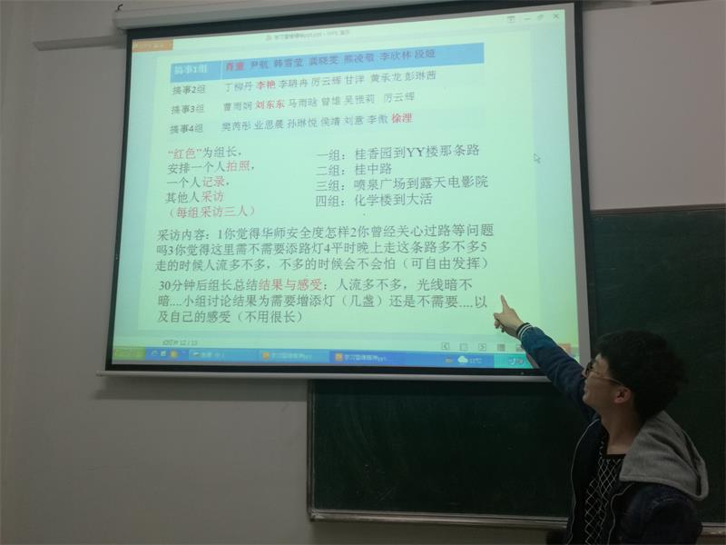 活动的第二项,由5班班长徐浬总结上次发放的有关华师校园安全问题的问卷调查结果,结果表明有高达百分之九十的学生认为校园存在安全隐患。在充分了解过雷锋同志的事例之后,同学们都蠢蠢欲动想要从身边的小事做起践行雷锋精神。为了让同学们更加深入的领会雷锋精神,学生分为四个小组并派往不同的路段进行现场随机采访和人流量统计。