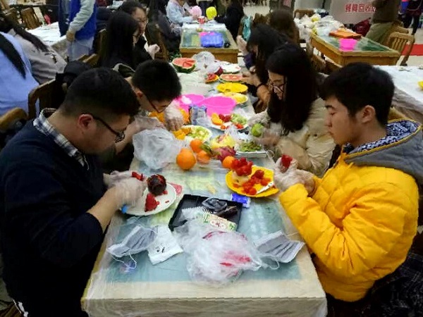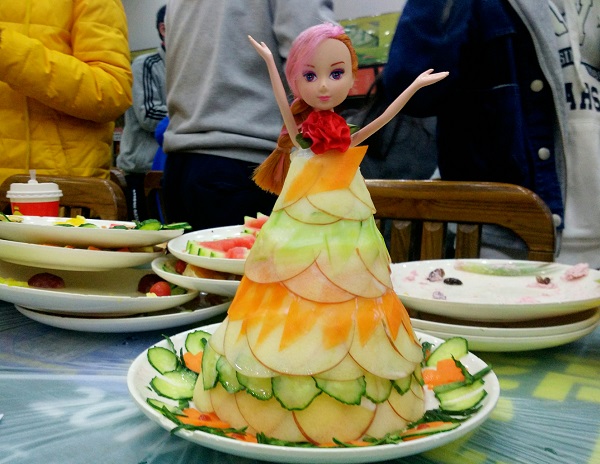 在最后压轴的“拼盘制作”环节中,各小组在限定的50分钟内完成了各式各样的美食拼盘:第7组的“金刚的裙摆”将水果切片贴成芭比娃娃的蓬蓬裙;第34组带来的作品“东京热”则采用水果、蔬菜、熟食多种食材为原料;第28组的“花漾年华”以沙拉多样的口感寓意大学五彩缤纷的生活……