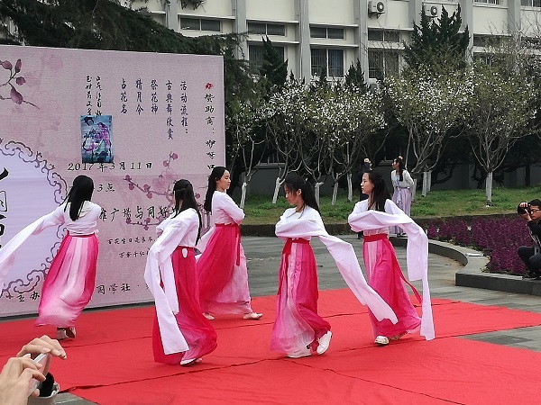 团日活动当天,正是百花的生日,卿衣汉服社在博雅广场举办了花朝节庆典。而花朝节庆典正好与此次1601团日活动主题“传统文化”遥相呼应。为欣赏汉服之美,了解花朝节之由来,1601班的同学们纷纷驻足观看,倾倒于我国的传统文化的魅力。