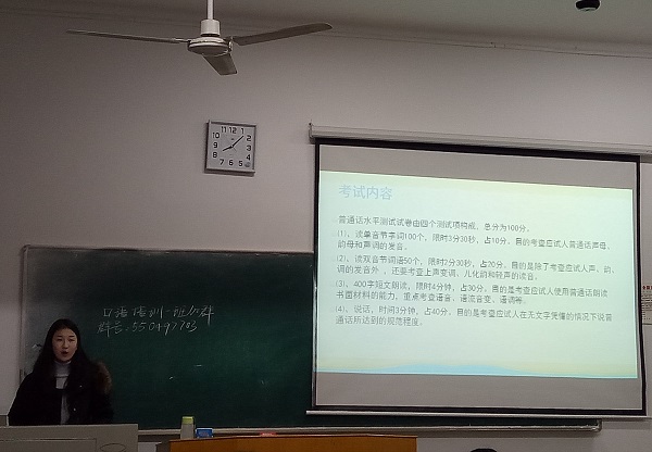 13日培训的主讲人是教师口语表达训练指导团队的裘立渤同学,她通过发音技巧讲解,结合实例练习游戏,对同学们进行培训指导。培训开始前,口语一班班长董玉洁首先介绍了活动的宗旨以及活动的主讲人和指导人员;随后,培训在一个轻松简短的视频中拉开序幕。裘立渤简单介绍了普通话考试的技巧以及课下学习的方法,并从发音部位、发音方法、声母辨析三个方面,对声母进行了讲解。