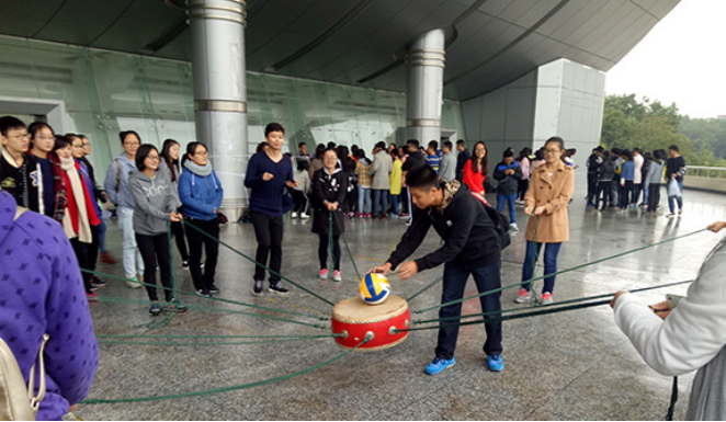 在“挑战150”项目中,“教化队”的组员们挑战了十人一组连续用鼓颠球六个,初始体验时,球在组员的手里不断落地,但在总结经验后,得出了颠球的窍门。在忽慢忽快的节奏下,球被一次次的抛起落下,用最短的时间完成了任务。“虎口脱险”中,各组想尽办法将组员一个接一个从“虎口”中脱出,并且不能触碰任何绳子。最后一人过绳时,尝试了几遍,在对面同伴的帮助下,顺利脱险。“盲人方阵”,“袋鼠跳传气球”与“球球大作战”中,各组也是表现精彩万分。各组组员在本组活动时高声欢呼与加油,为本组出谋划策,并积极参与其中。