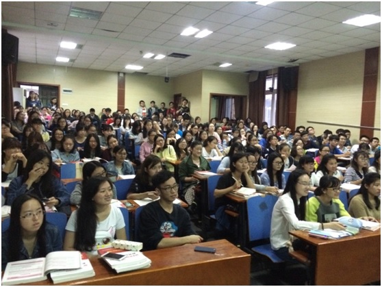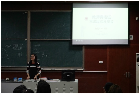 随后上场为大家讲解的是赵凡学姐,当她提到自己只用了一天时间来复习考试并通过了的时候,台下一片惊呼。而后,赵凡学姐让大家拿出笔试的各科参考书,为大家指明了重点与复习对策,帮助大家理清复习重点与规划,同学们纷纷表示十分受用。“我是在武大考试,那天武大的整个草坪上全都是背书的人。你就会惊讶为什么有那么多的人会为了这个不是很抢手的专业来竞争岗位,那个时候我非常紧张。但是当答题的时候,你就会发现你答题的速度远比别人快,这个时候你就会感觉到自己身为师范生的自豪与自信。”赵凡学姐这样描述她的考试状态,也给了同学们很大的鼓舞。