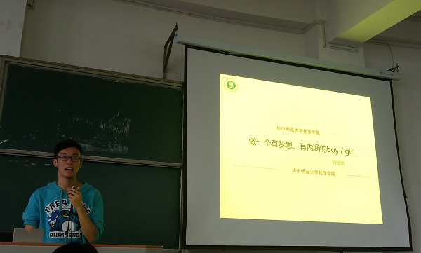 最后上台的刘运航学长有着丰富的师范、科研与实践经历。“大学需要具备形象思维和逻辑思维,这样才能够做好学生工作,搞好学习。”他以青蒿素结构简式和学生会招新笔试题目为基础,告诉同学们需要具有对专业知识的敏感性,关注时事,做事之前要有准备。刘运航学长将科研比喻为谈恋爱,鼓励同学们尝试科研,对科研要充满热情。在场同学无不被其生动有趣的语言感染。“做一个有梦想的人,做一个有内涵的人”,这是他对新生的寄语。