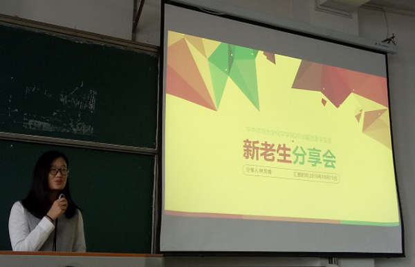 “大学就像一座银行,四年时间你需要在这个银行中储备知识、能力、情感、情趣”,来自应用化学1306班的林芳婧学姐上台说道。林芳婧学姐是华中师范大学2013级博雅计划成员。大学期间,学姐不仅完成了两项大学生创新创业项目,还多次获得各级奖学金,现已保送至浙江大学环境与资源学院。