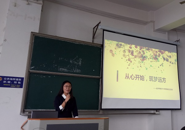 “本次活动希望同学们能敞开心扉,倾听来自心灵的建议,解开源于心灵的疑惑。从心开始,筑梦远方,向着未来,出发!”在主持人尹航一段精彩的开场白后,四位学长学姐依次上台,和同学们分享大学学习生活经验。