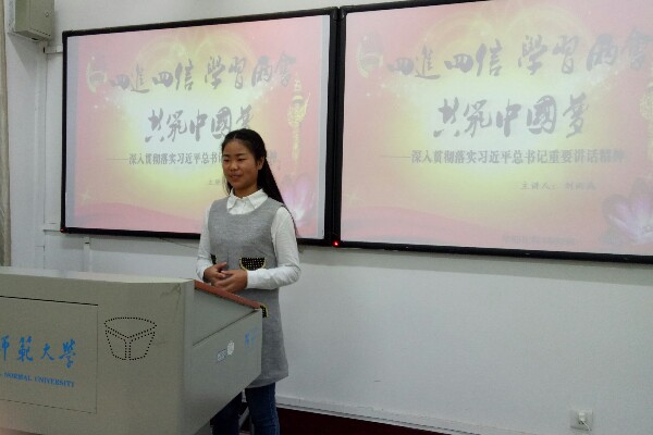 聂红桔同学则是结合了自己平时的学习生活,和同学们分享如何做到将四进四信精神贯彻到实际生活中。她激动地谈道:“我们团支部要好好办团日,将党团精神落实,影响更多的社会群众,营造积极向上的向党组织靠拢的氛围,坚定不移追随党的步伐。”动人的演讲赢得同学们的阵阵掌声。